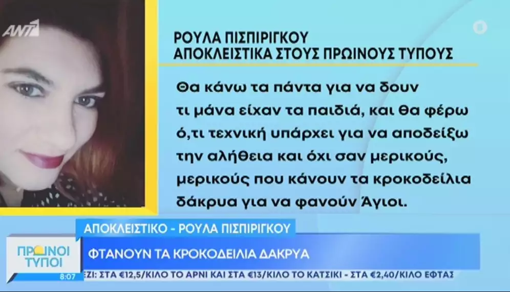 Ο Μάνος Δασκαλάκης δεν αναφέρει σε κανένα σημείο το όνομα, Ρούλα Πισπιρίγκου και τονίζει μεταξύ των άλλων στη συνέντευξη: «Θέλω να μάθω την αλήθεια για τα παιδιά μου. Από πού βρέθηκε η κεταμίνη, από πού προμηθεύτηκε την κεταμίνη. Πώς την έδωσε; Τι έγινε με τα άλλα δύο μου παιδιά».
