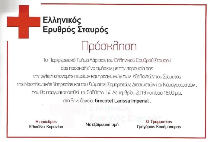 Το Περιφερειακό Τμήμα Λάρισας του Ελληνικού Ερυθρού Σταυρού σας προσκαλεί να τιμήσετε με την παρουσία σας την Τελετή Απονομής Πτυχίων και προαγωγών των εθελοντών του Σώματος της Νοσηλευτικής Υπηρεσίας και του Σώματος Σαμαρειτών, Διασωστών και Ναυαγοσωστών, που θα πραγματοποιηθεί το Σάββατο 14 Δεκεμβρίου 2019 και ώρα 18:00 μ.μ. στο Ξενοδοχείο GRECOTEL LARISSA IMPERIAL.