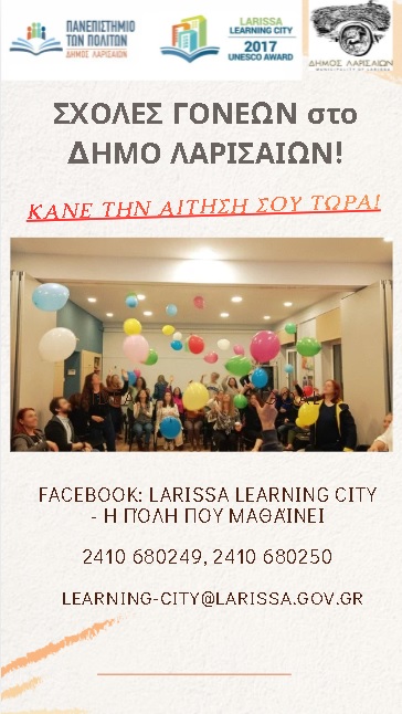 Πληροφορίες: Τμήμα Δια Βίου Μάθησης Δ. Λαρισαίων – 2410680249, 2410680250