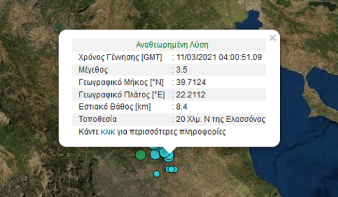 Στις 6 το πρωί της Πέμπτης – σύμφωνα με το Γεωδυναμικό Ινστιτούτο του Εθνικού Αστεροσκοπείου Αθηνών – σημειώθηκε δόνηση 3,5 Ρίχτερ. Η τοποθεσία ήταν 20 Χλμ. Ν. της Ελασσόνας. Το εστιακό βάθος ήταν 8.4 km