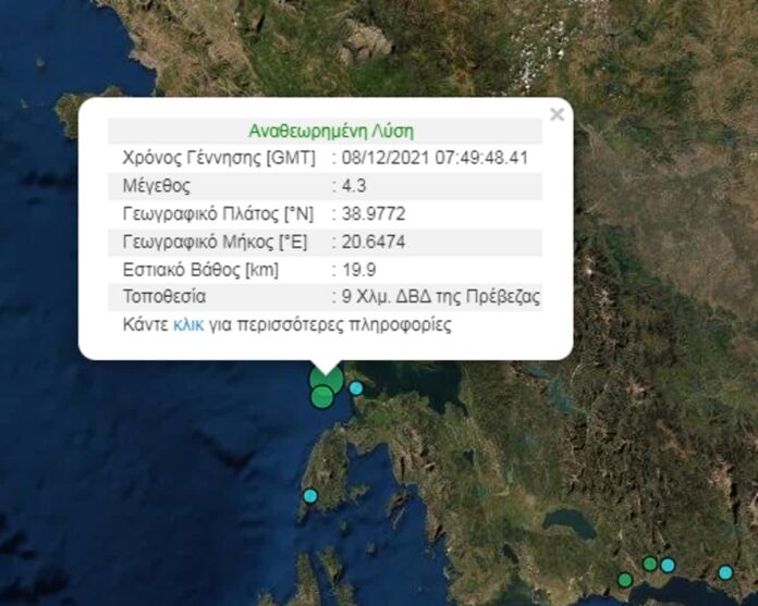 Σεισμός 4,3 Ρίχτερ σημειώθηκε κοντά στην Πρέβεζα, στις 09:49 ώρα Ελλάδος. Σύμφωνα με το Γεωδυναμικό Ινστιτούτο του Εθνικού Αστεροσκοπείου Αθηνών, ο σεισμός έγινε σε απόσταση 290 χλμ. δυτικά/βορειοδυτικά των Αθηνών.