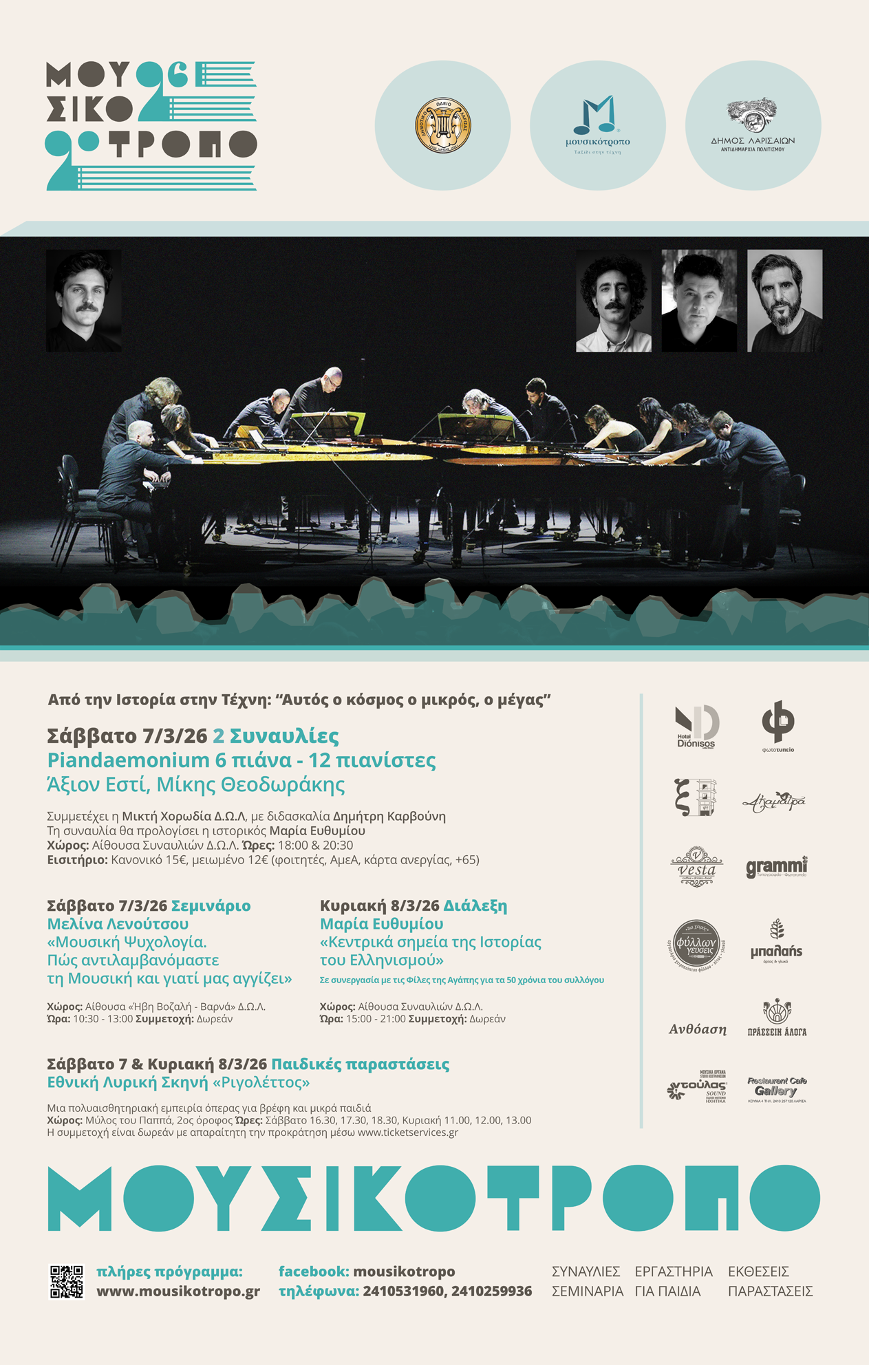 Το Φεστιβάλ Μουσικότροπο διοργανώνουν η Αντιδημαρχία Πολιτισμού του Δήμου Λαρισαίων και το Δημοτικό Ωδείο Λάρισας.