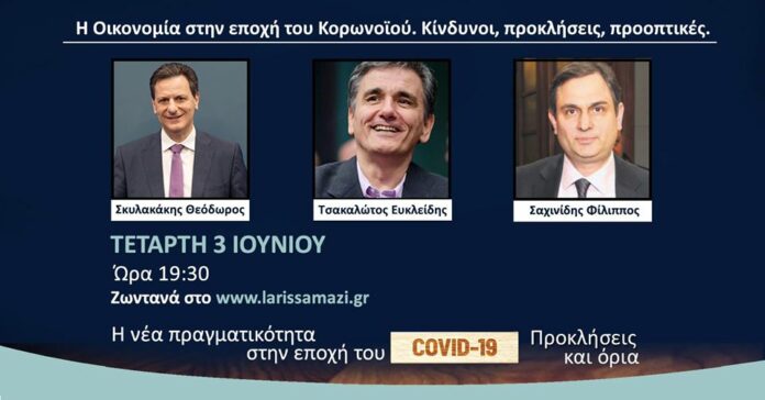 Εξαιρετικό ενδιαφέρον παρουσιάζει η διαδικτυακή συζήτηση που διοργανώνει ο Δήμος Λαρισαίων, σήμερα Τετάρτη 3 Ιουνίου, θέμα «Η Οικονομία στην εποχή του Κορωνοιού. Κίνδυνοι προκλήσεις προοπτικές» και με κεντρικούς ομιλητές τον κ. Θεόδωρο Σκυλλακάκη, Υφυπουργό Δημοσιονομικής Πολιτικής, τον κ. Ευκλείδη Τσακαλώτο, πρώην Υπουργό Οικονομικών, βουλευτή ΣΥΡΙΖΑ και τον κ. Φίλιππο Σαχινίδη, πρώην Υπουργό – μέλος του Εκτελεστικού Πολιτικού Συμβουλίου του ΚΙΝ.ΑΛ.