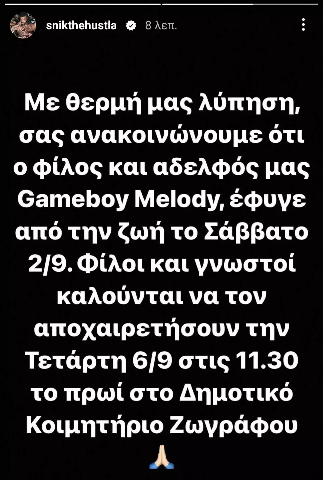 Μέσα από τον επίσημο λογαριασμό του στο Instagram, ο Snik θέλησε να αποχαιρετήσει τον «αδελφό» του γράφοντας χαρακτηριστικά: «Αναπαύσου εν ειρήνη αδελφέ μου». Στη συνέχεια, γνωστοποίησε ότι η κηδεία του Gameboy Melody θα πραγματοποιηθεί την Τετάρτη 6 Σεπτεμβρίου στις 11.30 το πρωί στο Δημοτικό Κοιμητήριο Ζωγράφου.