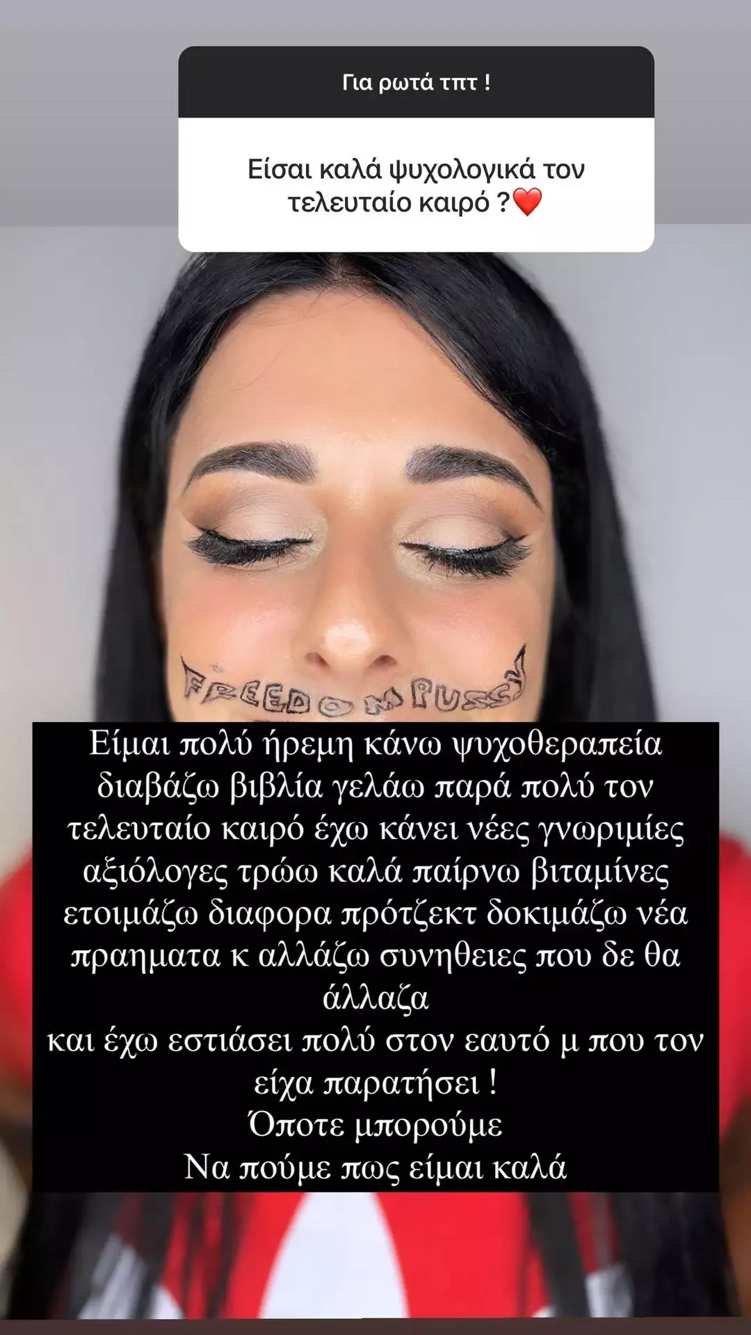 «Είμαι πολύ ήρεμη, κάνω ψυχοθεραπεία, διαβάζω βιβλία, γελάω πάρα πολύ τον τελευταίο καιρό, έχω κάνει νέες γνωριμίες, τρώω καλά, παίρνω βιταμίνες, ετοιμάζω διάφορα πρότζεκτ, δοκιμάζω νέα πράγματα κι αλλάζω συνήθειες που δεν θα άλλαζα. Έχω εστιάσει πολύ στον εαυτό μου που τον είχα παρατήσει! Οπότε μπορούμε να πούμε πως είμαι καλά».