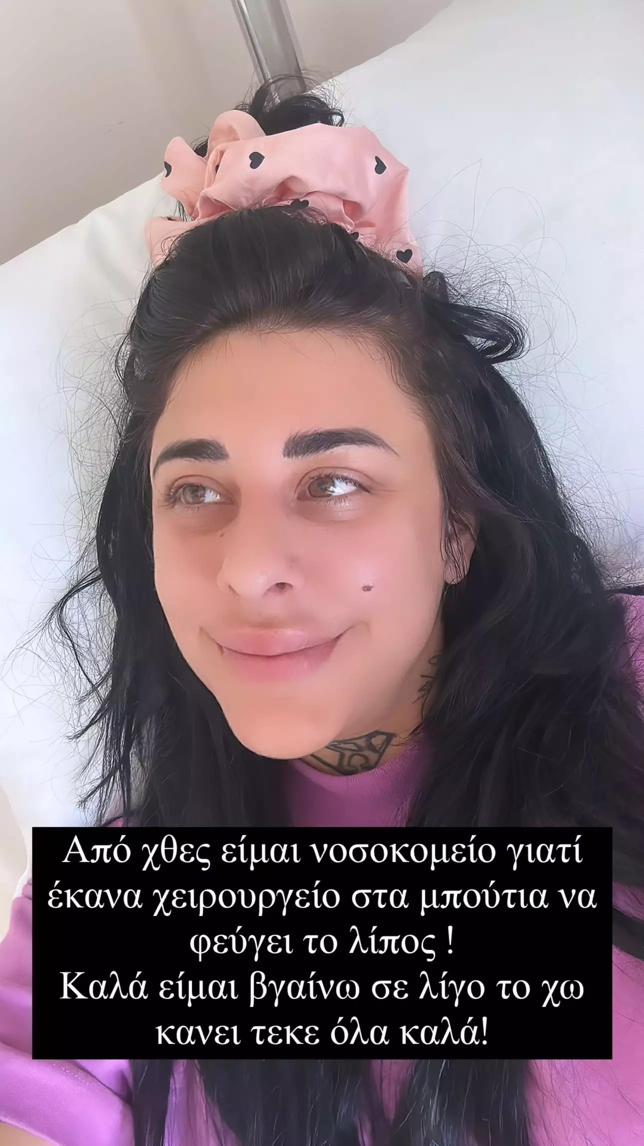 «Από χθες είμαι νοσοκομείο γιατί έκανα χειρουργείο στα μπούτια να φύγει το λίπος. Καλά είμαι, βγαίνω σε λίγο, το χω κάνει τεκέ, όλα καλά» έγραψε χαρακτηριστικά στην ανάρτησή της η γνωστή influencer.