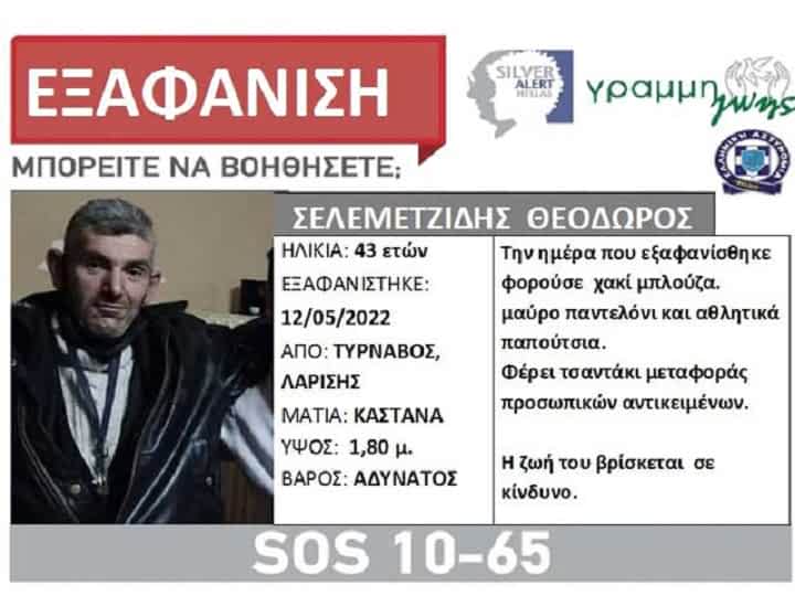 Ο Θεόδωρος Σελεμετζίδης, 43 ετών, εξαφανίστηκε από το σπίτι του, στον Τύρναβο Λαρίσης, την 12/05/2022. Έχει καστανά μάτια, ύψος 1,80μ και είναι αδύνατος.