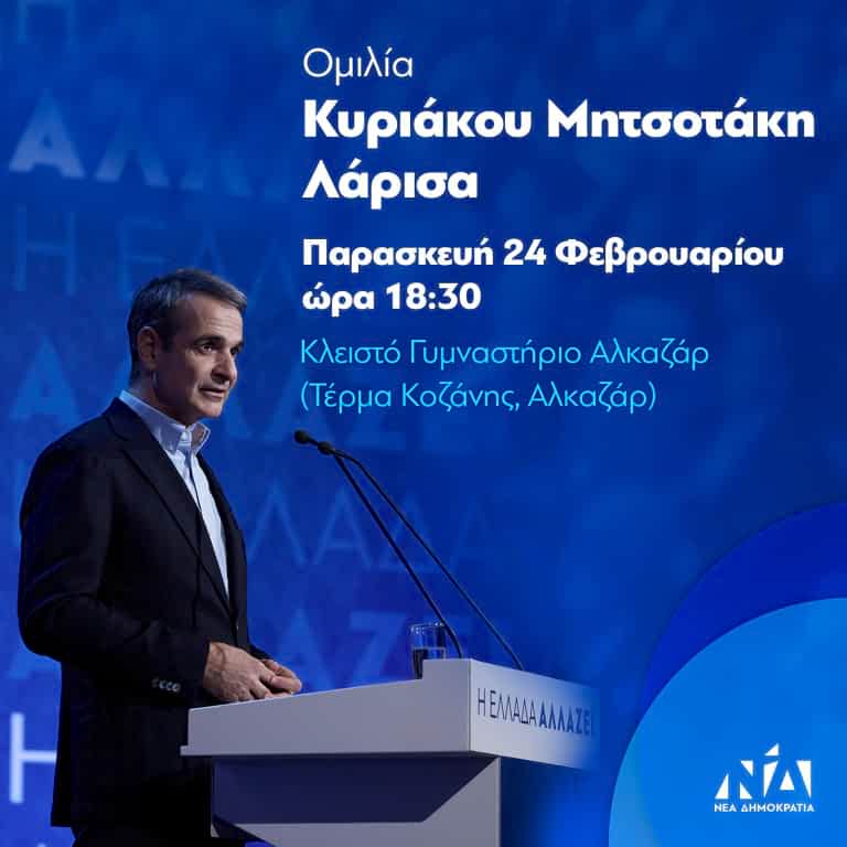 ΛΑΡΙΣΑΠΟΛΙΤΙΚΗ Στη Λάρισα την Παρασκευή ο Κυριάκος Μητσοτάκης 19 Φεβρουαρίου 2023 Την Λάρισα θα επισκεφτεί την Παρασκευή 24 Φεβρουαρίου ο πρωθυπουργός Κυριάκος Μητσοτάκης. Μάλιστα, όπως έγινε γνωστό από τη ΝΔ, θα πραγματοποιήσει ομιλία στο Κλειστό Γυμναστήριο Αλκαζάρ στις 18:30.