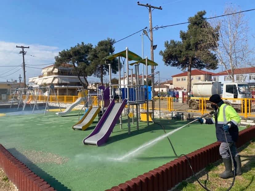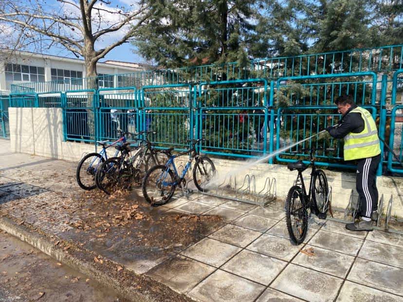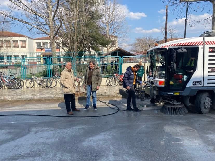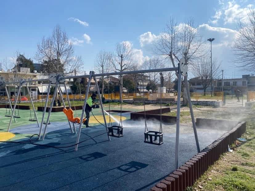 Ειδικότερα, προσωπικό και εξοπλισμός (σάρωθρα, 3 υδροφόρες, πλυντήριο κάδων και φορτωτής) ξεκίνησαν από νωρίς το πρωί να καθαρίζουν πλατείες , πάρκα πεζοδρόμους, σχολικές μονάδες και το χώρο του Κοιμητηρίου.