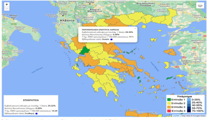 Διαθέσιμος είναι από σήμερα στο covid-19.gov.gr ο επιδημιολογικός χάρτης όπου καταδεικνύει ότι η περιφερειακή Ενότητα Λάρισας είναι μαζί με άλλες 27 Περιφέρειες στο επίπεδο 3 δηλαδή στο πορτοκαλί.