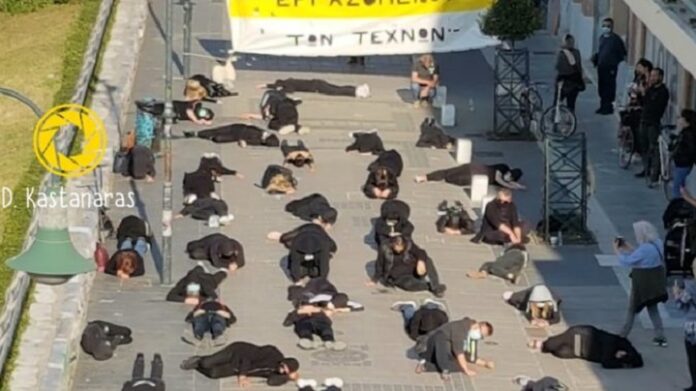 Εργαζόμενοι στον χώρο των τεχνών και αλληλέγγυοι ντυμένοι στα μαύρα έπεσαν στο έδαφος με μια ταυτόχρονη κίνηση, στέλνοντας το δικό τους μήνυμα για τη στήριξη των καλλιτεχνών, σε μια δράση που έκανε αίσθηση στη Λάρισα.