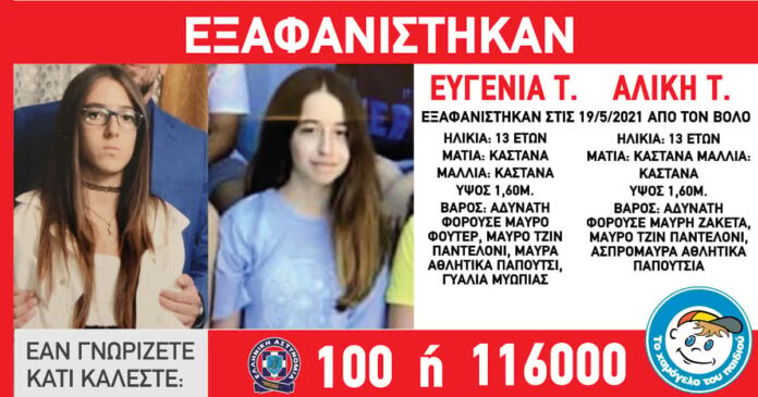 Στις 19 Μαΐου 2021 μεσημεριανές ώρες, εξαφανίστηκαν από το σπίτι τους στην περιοχή του Βόλου, οι ανήλικες Ευγενία Τ., 13 ετών, και Αλίκη Τ., 13 ετών,. Η ανήλικη Ευγενία T. έχει ύψος 1.60 μ., είναι αδύνατη, έχει καστανά μαλλιά και καστανά μάτια.
