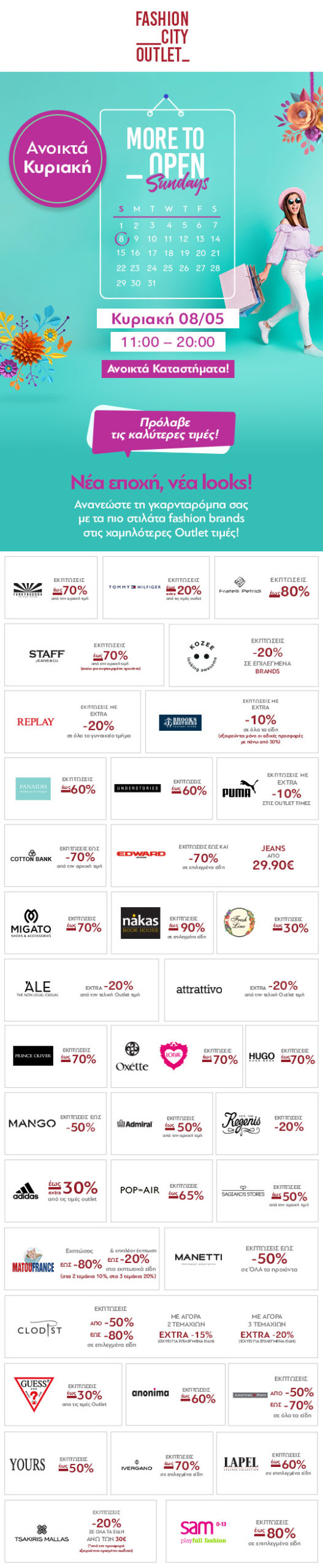 Σημειώστε πως τα εμπορικά καταστήματα του Fashion City Outlet θα είναι ανοικτά και την Κυριακή 8/5 από τις 11:00 το πρωί έως και τις 08:00 το βράδυ, για ακόμη περισσότερες αγορές εκπτώσεων.