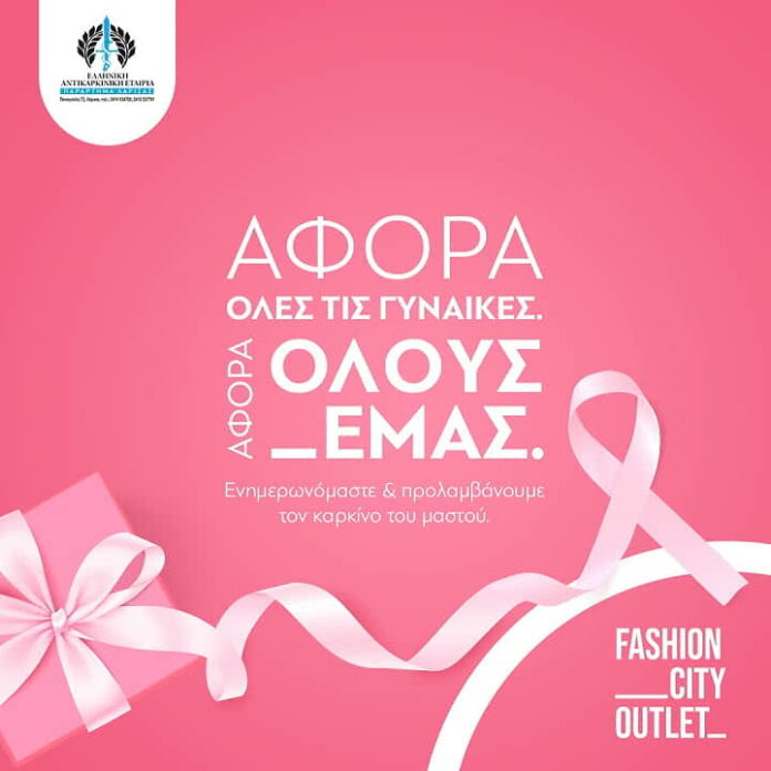 Το Fashion City Outlet αποδεικνύοντας για ακόμη μια φορά την κοινωνική του ευαισθησία ενισχύει το έργο της Ελληνικής Αντικαρκινικής Εταιρείας, Παράρτημα Λάρισας, στο πλαίσιο του εορτασμού της 25ης Οκτωβρίου που έχει καθιερωθεί ως η Παγκόσμια Ημέρα κατά του Καρκίνου του Μαστού και είναι αφιερωμένη στην πρόληψη, τη σωστή ενημέρωση και την ευαισθητοποίηση όλων των γυναικών.