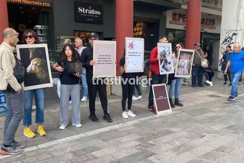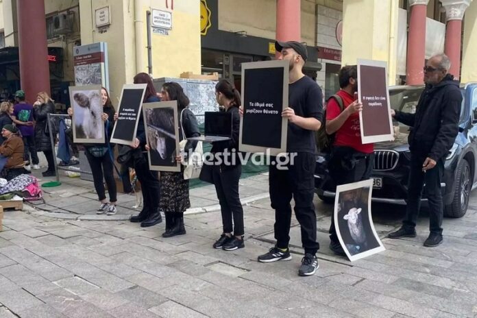Ομάδα ζωόφιλων ακτιβιστών vegan πραγματοποίησε παράσταση διαμαρτυρίας το μεσημέρι του Μεγάλου Σαββάτου στην αγορά Βλάλη, λίγα μέτρα από το Καπάνι, στο κέντρο της Θεσσαλονίκης.