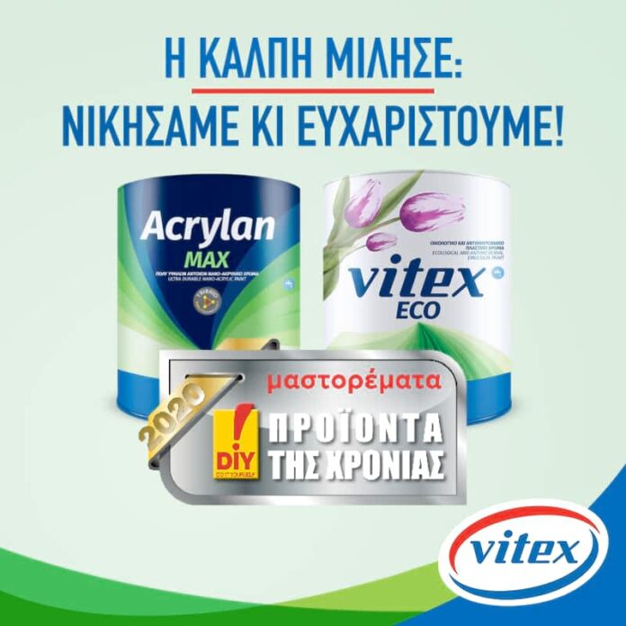 Πιο αναλυτικά, το Vitex Eco και το Acrylan Max ανακηρύχθηκαν DIY Προϊόντα της Χρονιάς 2020 στην κατηγορία «Χρώματα & Βερνίκια» και «Καινοτομία» αντίστοιχα, στο πλαίσιο του διαγωνισμού DIY Προϊόντα της Χρονιάς 2020 που διοργάνωσε για 13η συνεχή χρονιά το περιοδικό «μαστορέματα».