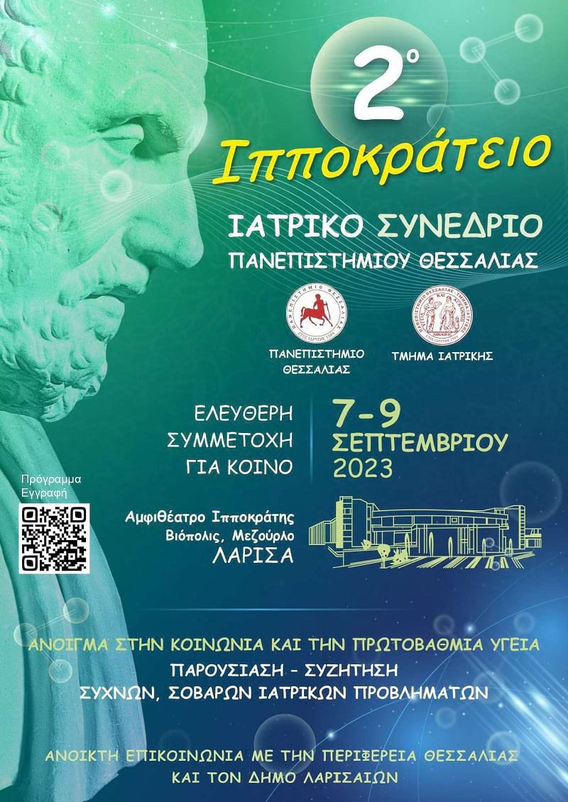 Με τη συμμετοχή δεκάδων πανεπιστημιακών γιατρών και γιατρών του ΕΣΥ της δύναμης του τμήματος Ιατρικής της Σχολής Επιστημών Υγείας του Πανεπιστημίου Θεσσαλίας και με ένα υψηλού επιπέδου πρόγραμμα πραγματοποιείται στη Λάρισα το 2ο Ιπποκράτειο Συνέδριο από τις 7 έως τις 9 Σεπτεμβρίου 2023 στο αμφιθέατρο «Ιπποκράτης» στην έδρα της Ιατρικής Σχολής «Βιόπολις».