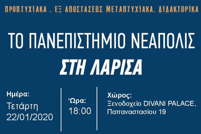 Ημέρα γνωριμίας στη Λάρισα διοργανώνει το Πανεπιστήμιο Νεάπολις Πάφου, για να παρουσιάσει τα εκπαιδευτικά του προγράμματα.
