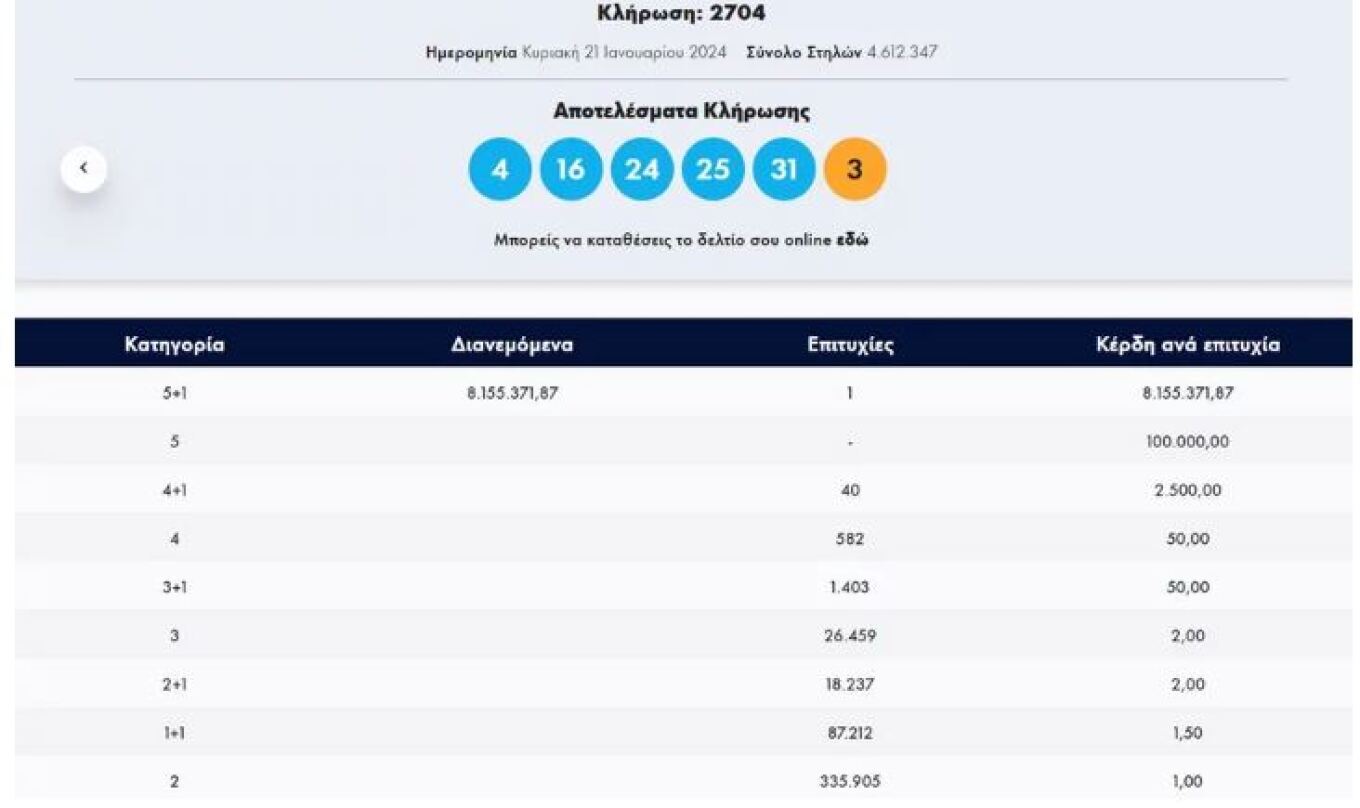 Οι τυχεροί αριθμοί της κλήρωσης της Κυριακής ήταν 4, 16, 24, 25, 31 και τζόκερ το 3.