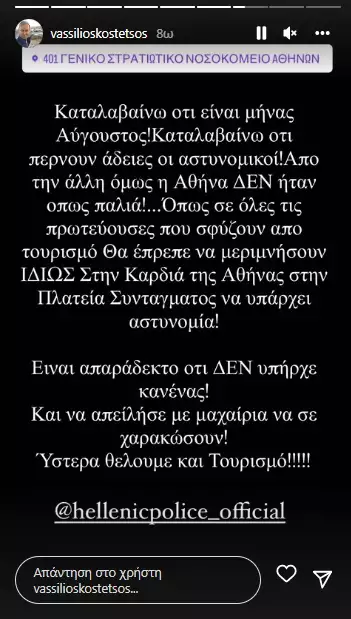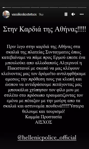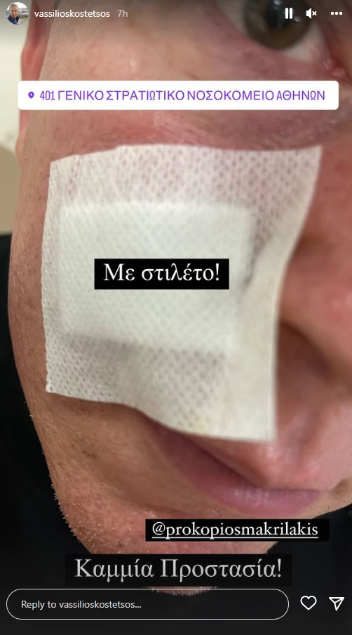 Την είδηση της επίθεσης έκανε γνωστή ο ίδιος ο Βασίλειος Κωστέτσος μέσα από ένα story στον προσωπικό λογαριασμό του στο Instagram.