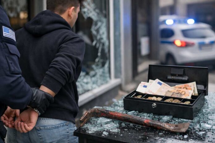 Σύμφωνα με την έρευνα, λίγο πριν τη σύλληψή του, έσπασε με σιδερένιο λοστό την τζαμαρία καταστήματος στο κέντρο της πόλης, μπήκε στο εσωτερικό και άρπαξε κερματοθήκη και κουτιά με συνολικά 721 ευρώ.