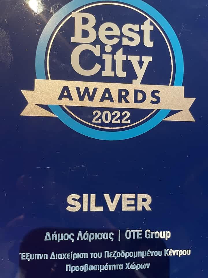 Βραβείο για την υλοποίηση του έργου « Έξυπνο Σύστημα Διαχείρισης του Πεζοδρομημένου Κέντρου», απονεμήθηκε στο Δήμο Λαρισαίων και στον Ομιλο OTE στο πλαίσιο των Best City Awards 2022.