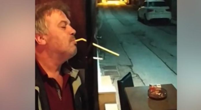 Στο επίμαχο βίντεο, τον βλέπουμε να ρουφάει αρχικά το τσιγάρο και στη συνέχεια να φυσάει τον καπνό στο καλαμάκι, για να καταλήξει εκτός καταστήματος.