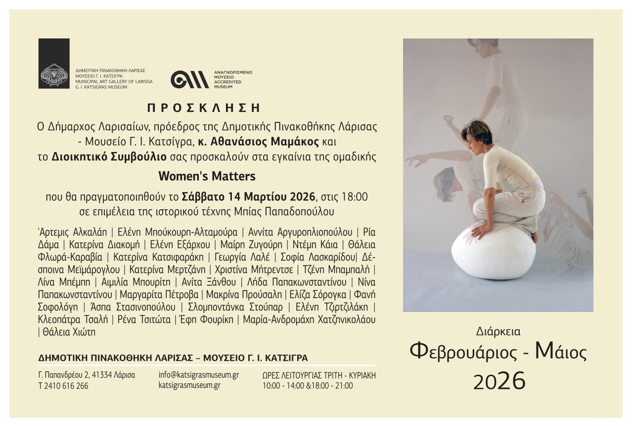H ομαδική έκθεση «Women’s Matters» διοργανώνεται από το Δήμο Λαρισαίων στη Δημοτική Πινακοθήκη Λάρισας – Μουσείο Γ. Ι. Κατσίγρα σε επιμέλεια της ιστορικού τέχνης Μπίας Παπαδοπούλου.