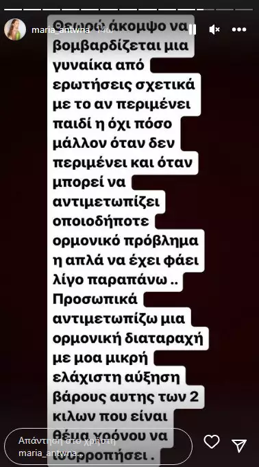 «Είσαι έγκυος, το μωράκι θα είναι κοριτσάκι γιατί το πρόσωπό σου αγρίεψε», ήταν το σχόλιο που έκανε τη Μαρία Αντωνά να ξεσπάσει και να απαντήσει με νέες αναρτήσεις.